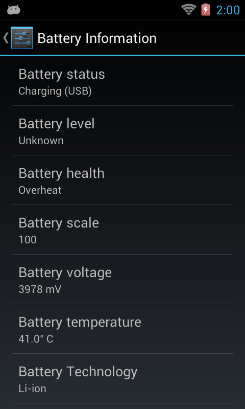 Mientras cargo mi dispositivo jellybean 4.1 en el usb de mi pc, veo el siguiente icono rojo de la batería en la barra de android bateria . Hoy le cargue nafta (tenia menos de medio tanque) y estacione frente a casa a probar el estereo ( es el original de peugeot , confirme que no tiene mp3).